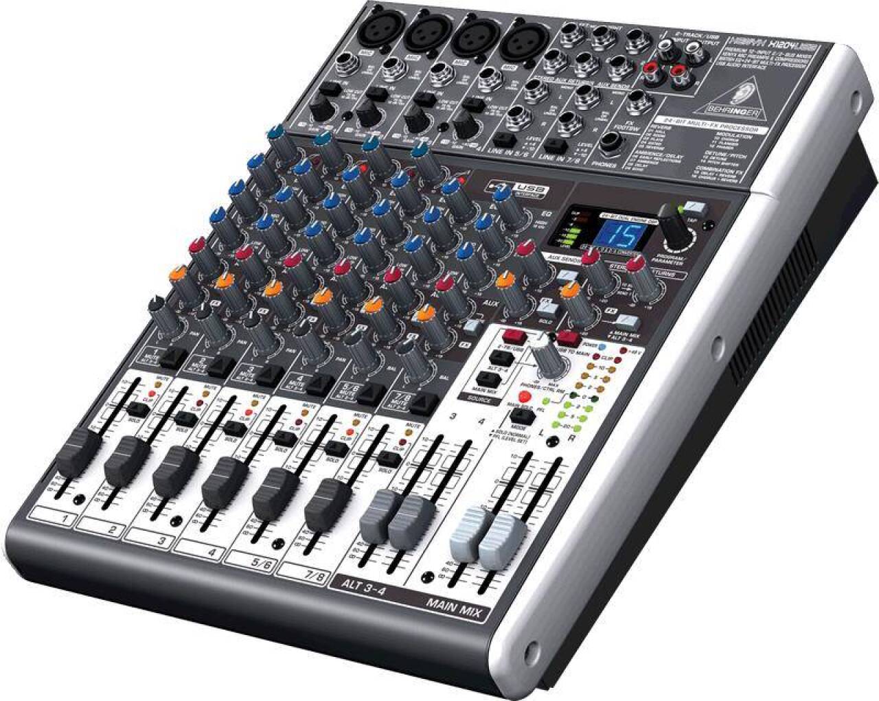 XENYX X1204USB имеет 8 основных канальных входов: 4 монофонических и 2 пары стереофонических. Кроме этого предусмотрено 2 стереоканала для ALT 3-4 шины. 4 микрофонных входа совместимы с динамическими и конденсаторными микрофонами, поскольку микшер имеет функцию отключаемого фантомного питания. Во избежание появления паразитарных шумов микрофонная секция оснащена фильтрами низких частот, а для предварительной нормализации звука вокала или инструмента имеются фирменные предусилители Behringer.