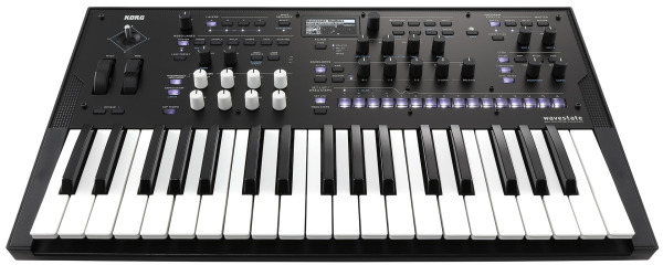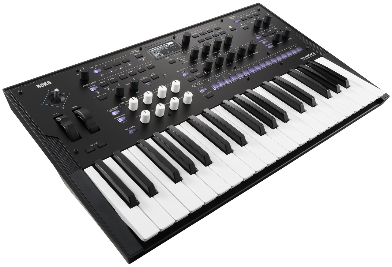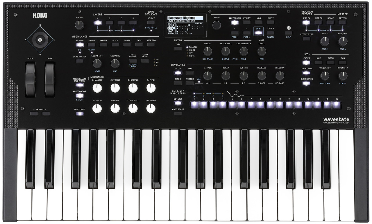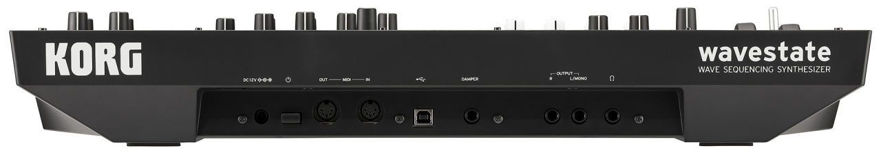 Korg Wavestate – современное переиздание легендарного синтезатора, который впервые представил миру секвентирование звуковых волн, трансформируя сэмплы в уникальные звуки. Новый WAVESTATE – это следующий шаг в цифровом синтезе, компактное устройство с 37 клавишами, которое использует звуковой движок Wave Sequencing 2.0, объединяющий сигнал в секвенции. Он позволяет разделять сэмплы на полосы и независимо изменять характеристики: длительность, ритм, форму волны на отдельных отрезках. Каждая полоса может иметь собственное начало, конец и точки зацикливания. Отдельные полосы объединяются в выходной сигнал. WAVESTATE позволяет получить органические, постоянно изменяющиеся звуки, каждая нота в аккорде может звучать по-разному. Полифония – 64 стерео голоса. Синтезатор обладает богатыми возможностями управления, при этом достаточно привычными и понятными. На передней панели размещены секции настройки фильтров, огибающих, управление LFO и эффектами, секция модуляции, предусмотрено восемь настраиваемых регуляторов для управления в реальном времени. Отдельная клавиша, отмеченная игральной костью, позволяет генерировать совершенно новые звуки с использованием рандомизатора.