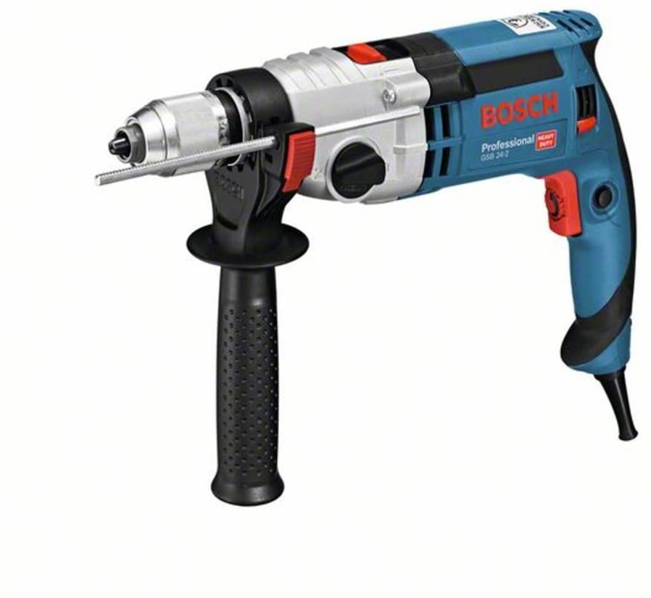 Ударная дрель Bosch GSB 24-2 создана для выполнения несложных работ бытового характера. Устройство имеет 2 скорости работы. Благодаря реверсу возможно также выворачивание шурупов и самого инструмента при его заклинивании в материале. Упор для несквозного сверления гарантирует высокую точность работ. Быстрозажимной патрон обеспечивает простую процедуру установки насадок. В кейсе можно переносить инструмент вместе с рабочей оснасткой. Ударный режим позволяет работать инструменту с максимальной скоростью 51000 ударов в минуту. При безударном сверлении скорость регулируется в пределах 0-3000 оборотов в минуту. Возможность выбора числа оборотов позволит качественно сверлить дерево, металл, керамику и другие материалы.